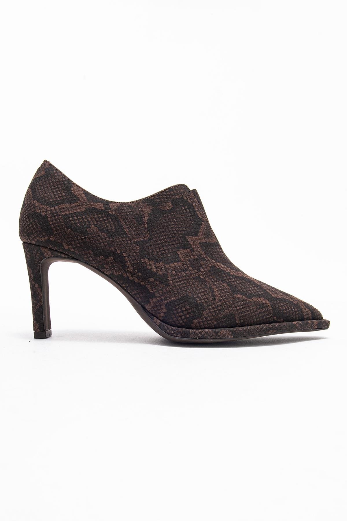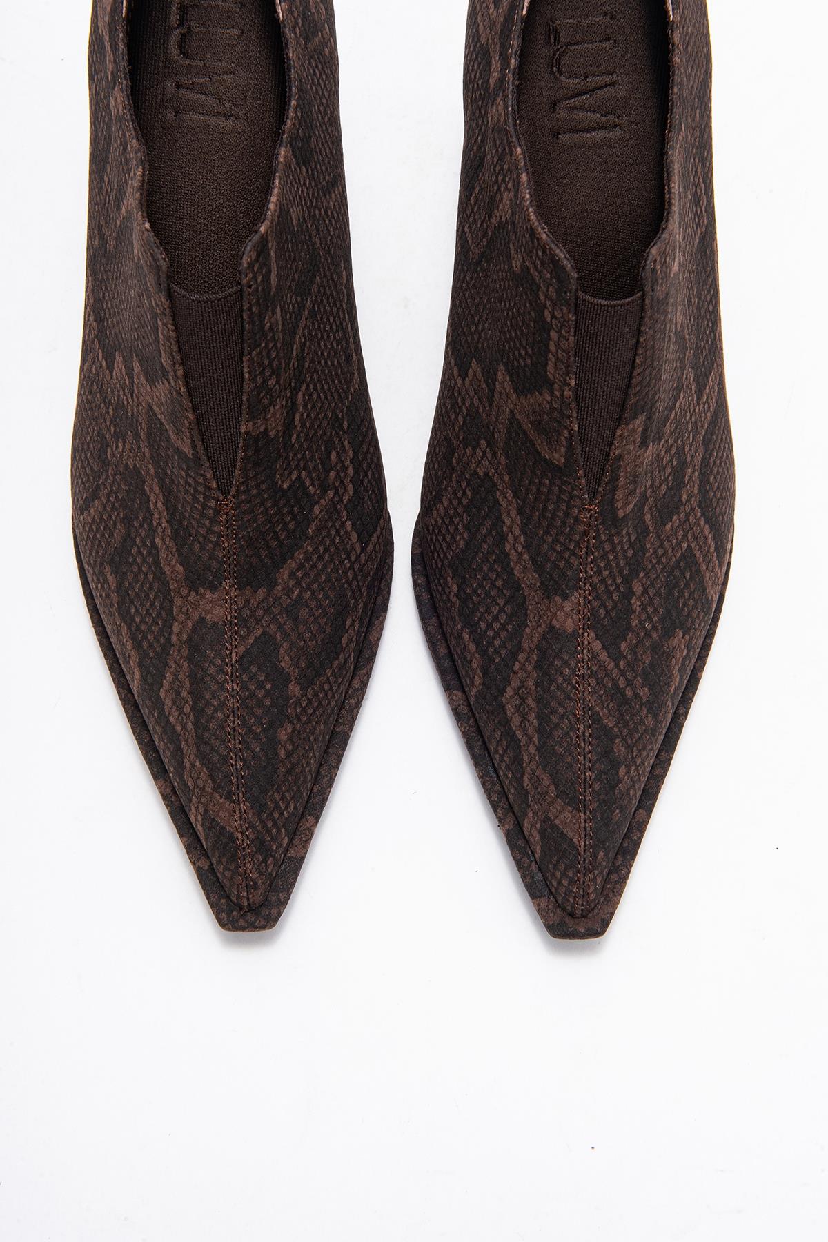 Kahverengi yılan desenli yüzeyiyle ALYA, sofistike ve cesur stilinizi zarif bir şekilde tamamlıyor. Sivri burun tasarımı ve ön üst kısmındaki minik elastik detayıyla modern bir duruş sunarken, neredeyse bileğe kadar uzanan yapısı bacaklarınızın siluetini şıkça ön plana çıkarır. İnce topuğu adımlarınıza feminen bir zarafet katarken, kaliteli malzemesi gün boyu konfor sağlar. Özel davetlerden günlük şıklığa kadar her an, ALYA kahverengi yılan desenli tasarımıyla stilinizi bir adım öne taşıyor.