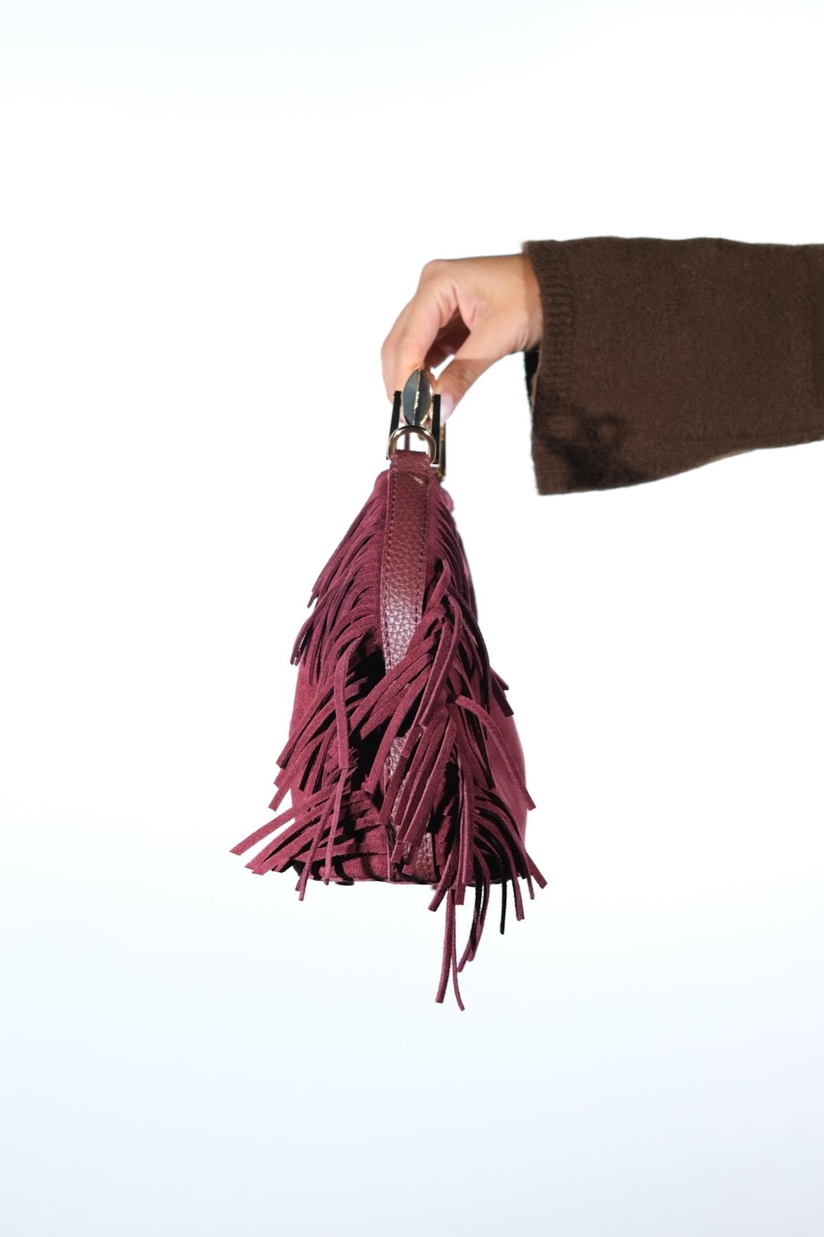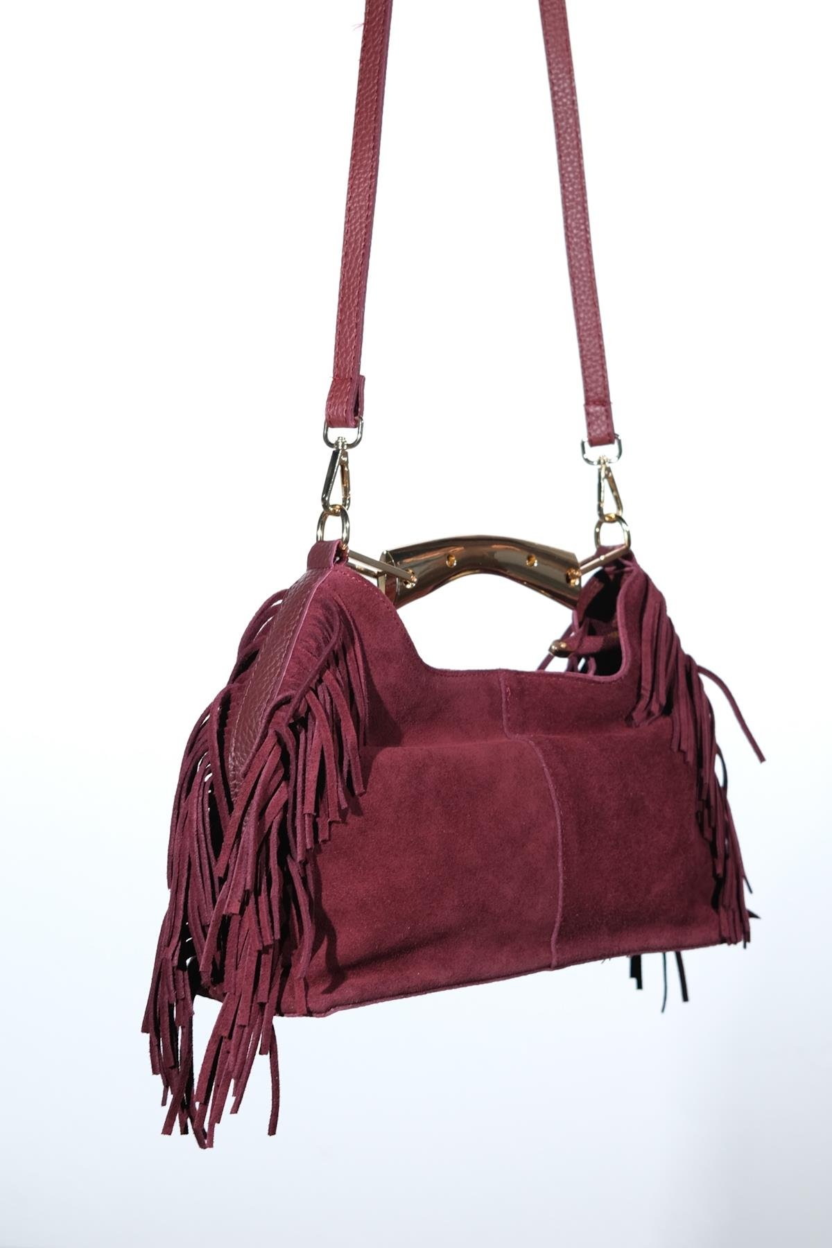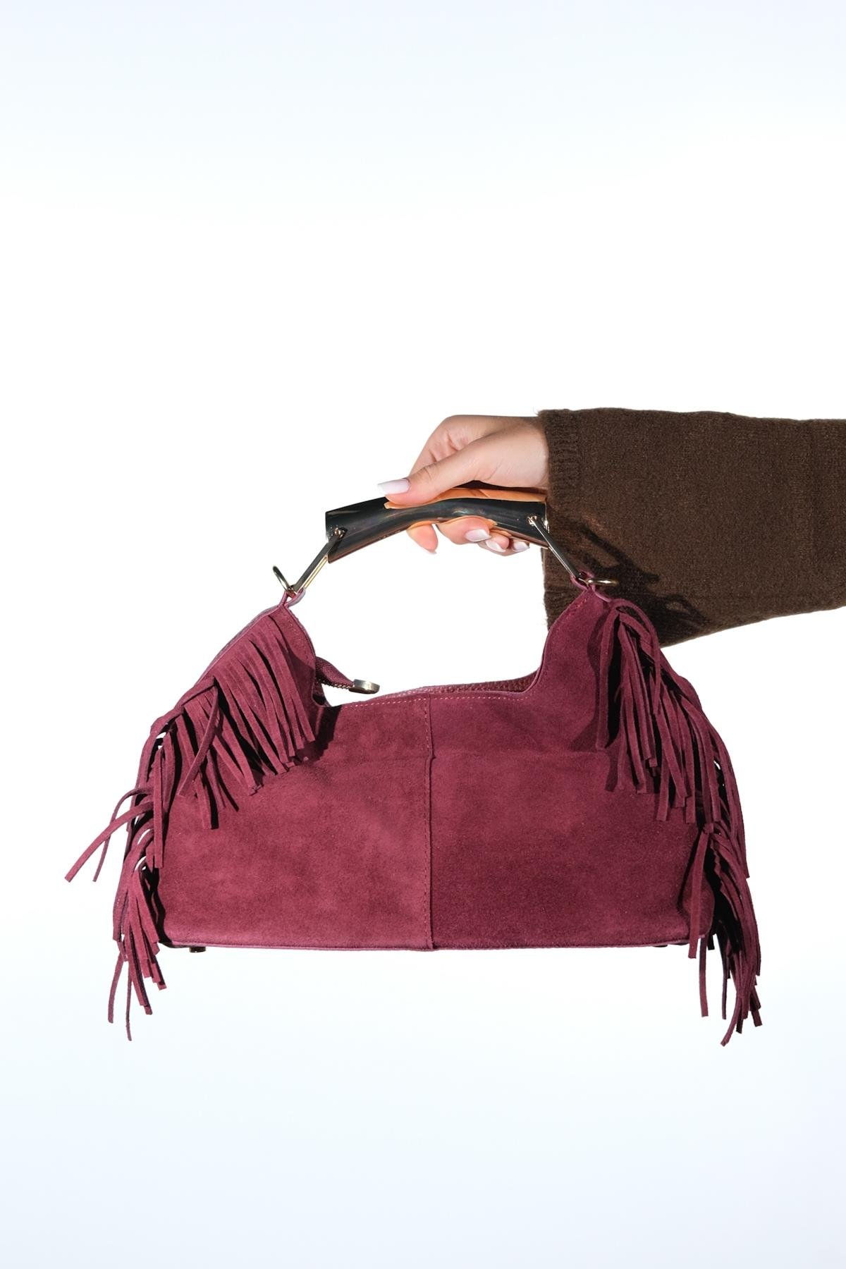 Süet kısımları hakiki deridir, askıları ve mat kısımları suni deridir. Tek gözden oluşmaktadır, fermuar kapamalıdır, uzun askısı mevcuttur, içi astarlıdır. Günlük kullanıma uygundur. %100 el işçiliği ile üretilmiştir.
