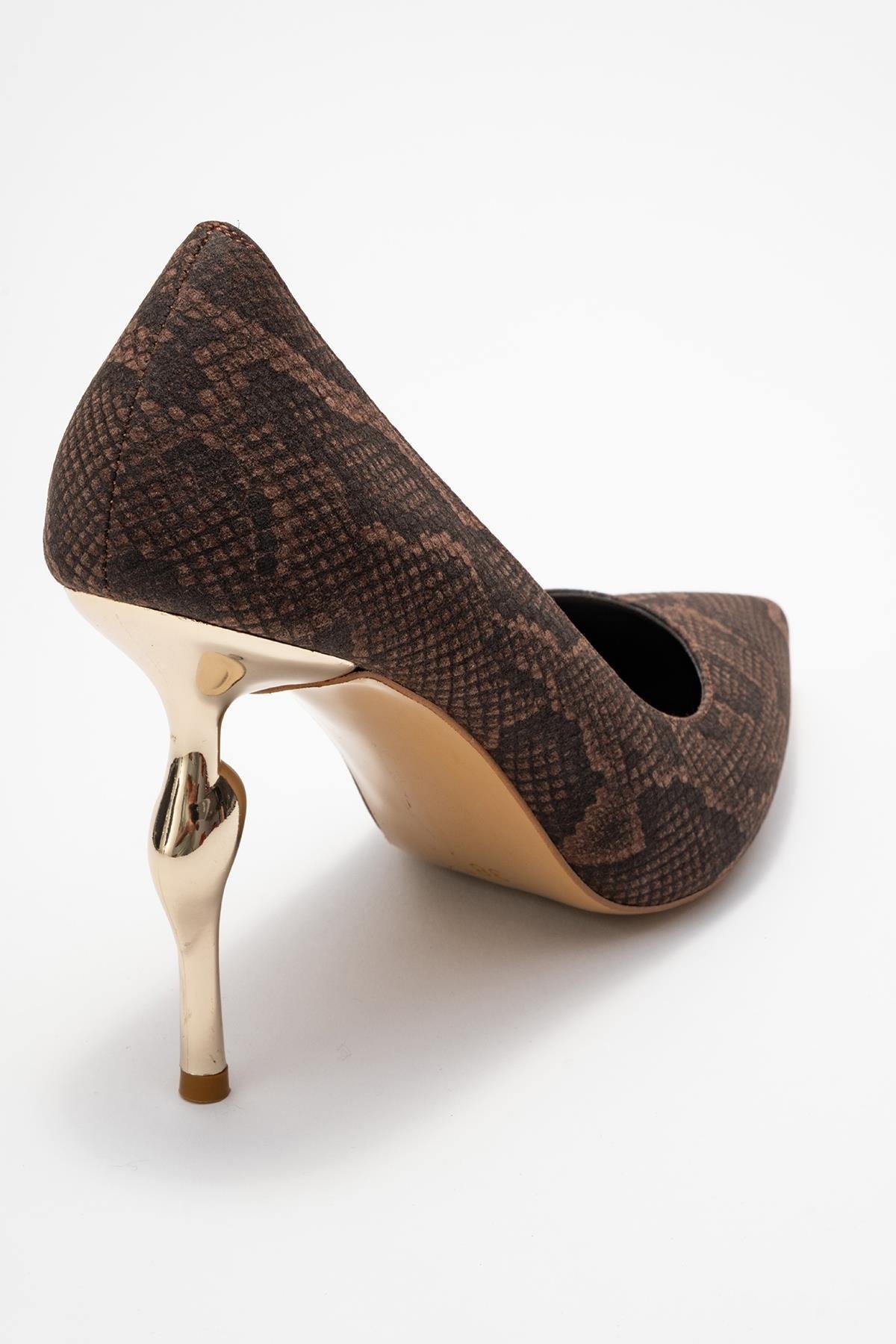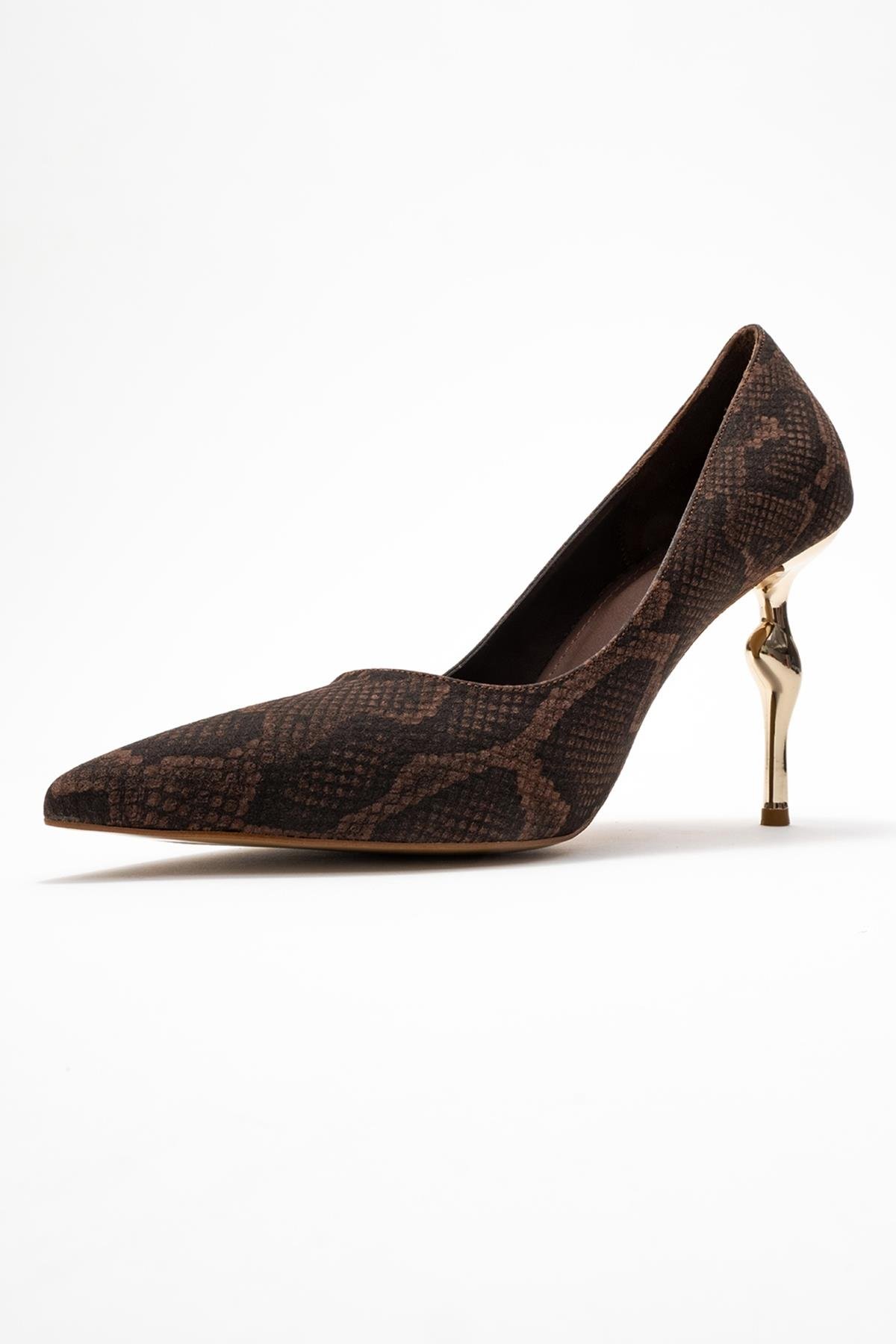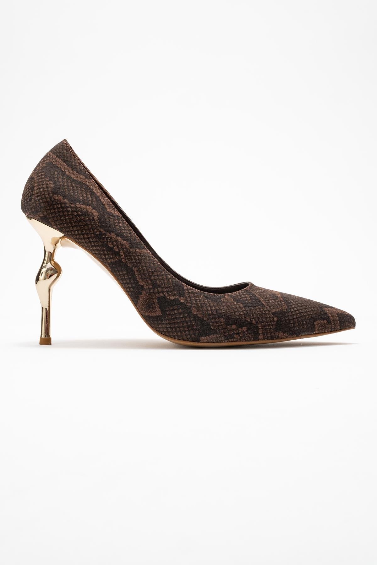 Vahşi dokunuş, sofistike zarafetle buluşuyor. HUDSON, iddialı tasarımıyla bakışları üzerinde topluyor. Deri görünümlü yılan deseni modern ve güçlü bir aura yaratırken, heykelsi gold metal topuk modele sanatsal bir karakter katıyor. Günün her anında stilinizi özgünleştiren HUDSON, cesur ruhu olanlar için tasarlandı.
