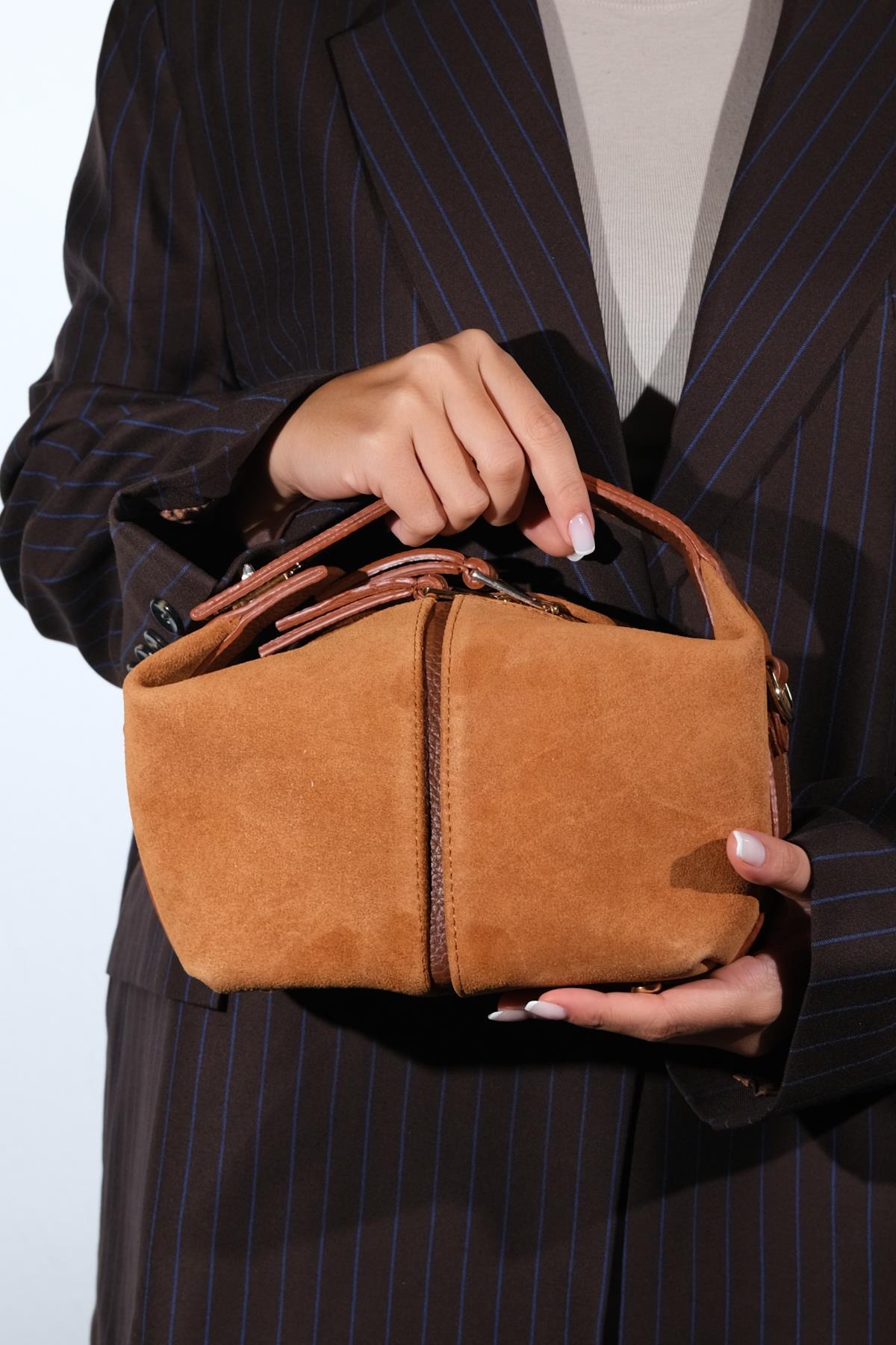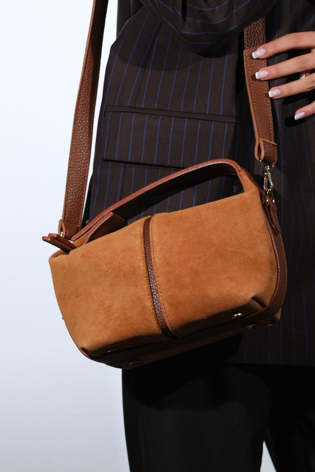 Süet kısımları hakiki deridir, askıları ve mat kısımları suni deridir. Tek gözden oluşmaktadır, fermuar kapamalıdır, uzun askısı mevcuttur, içi astarlıdır. Günlük kullanıma uygundur. %100 el işçiliği ile üretilmiştir.