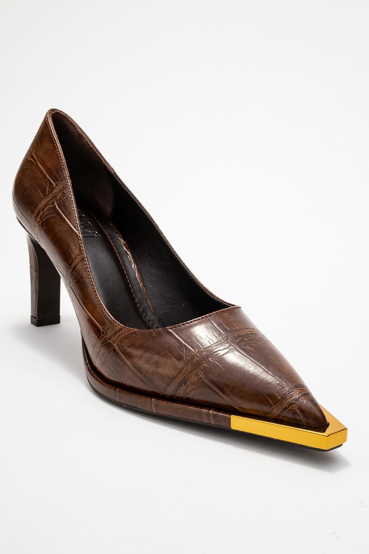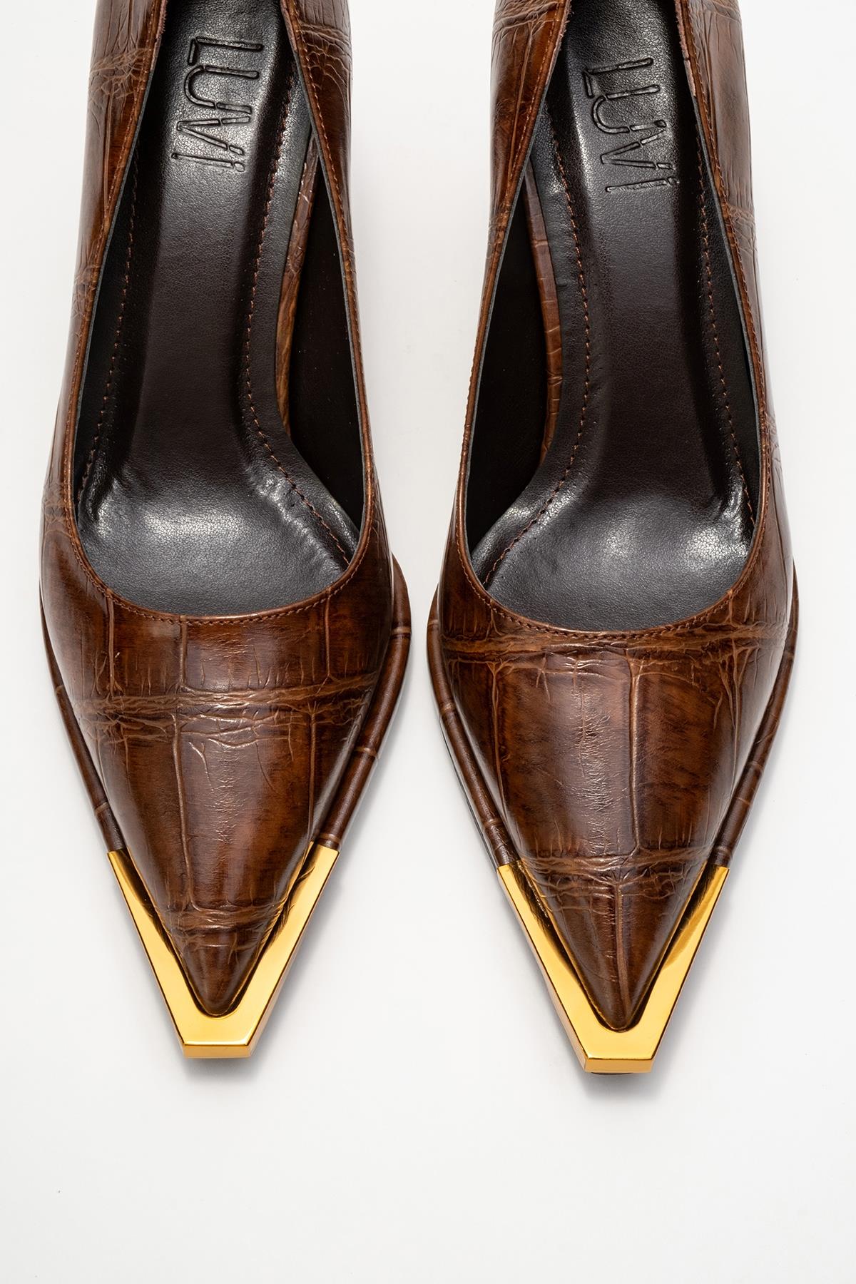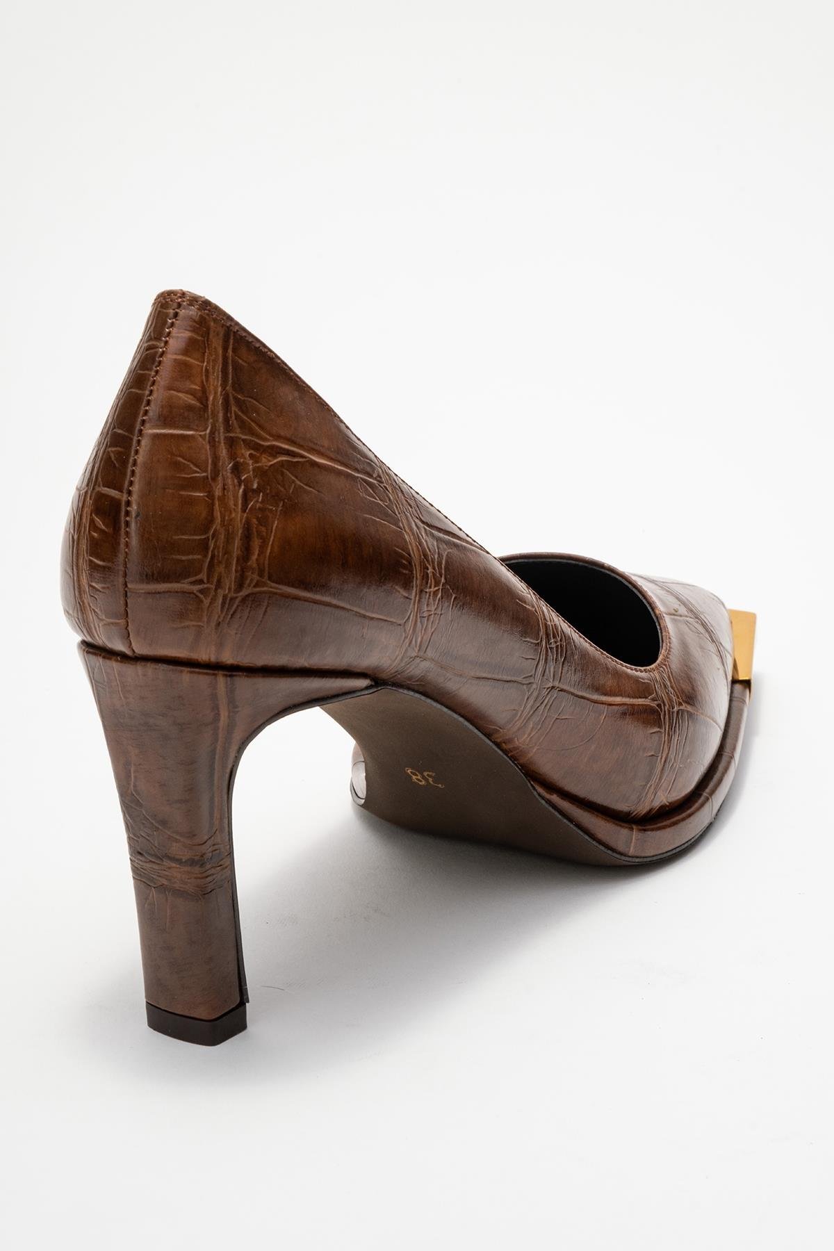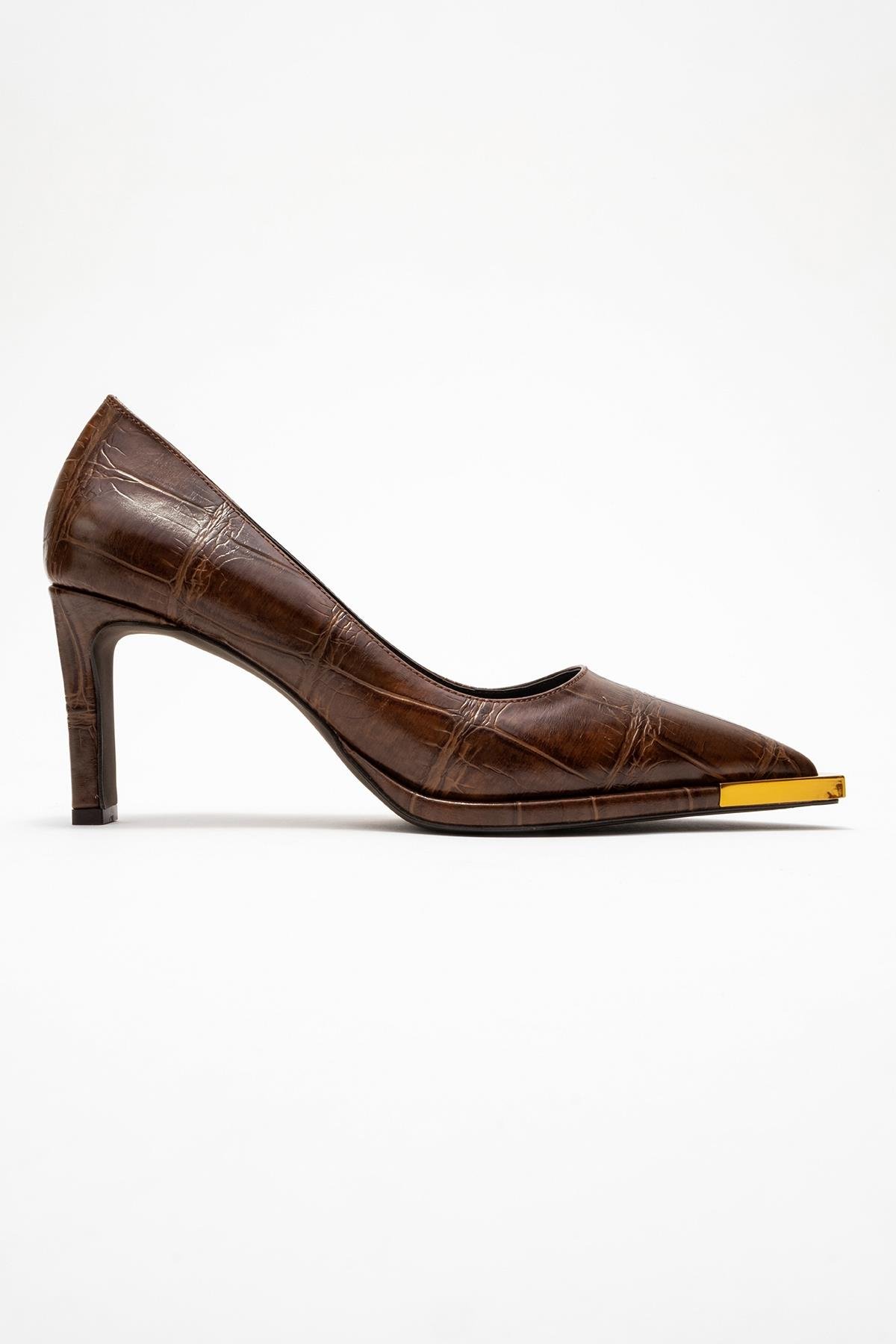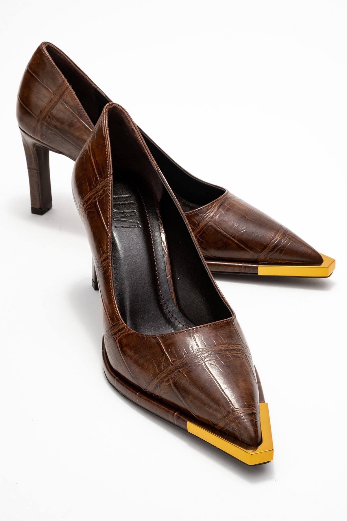 Sıcak kahverenginin sofistike tonunu altın ışıltısıyla buluşturan LIORA, klasik zarafeti modern bir ihtişama dönüştürüyor. Sivri burun tasarımını vurgulayan altın renkli metal detay, LIORA^ya göz alıcı bir kontrast kazandırarak güçlü bir stil ifadesi yaratıyor. Kahverengi yüzeyin lüks dokusu, her kombinle kolayca uyum sağlayan rafine bir şıklık sunarken, yüksek topuğun asil duruşu kadınsı zarafeti en etkileyici şekilde öne çıkarır. Altın dokunuşuyla hareketlenen LIORA, adımlarınıza cesur bir ihtişam ve zamansız bir ışıltı katar. Ofis şıklığından özel davetlere uzanan geniş kullanım alanıyla LIORA, göz kamaştıran detaylarıyla stilinizi yeni bir seviyeye taşır.