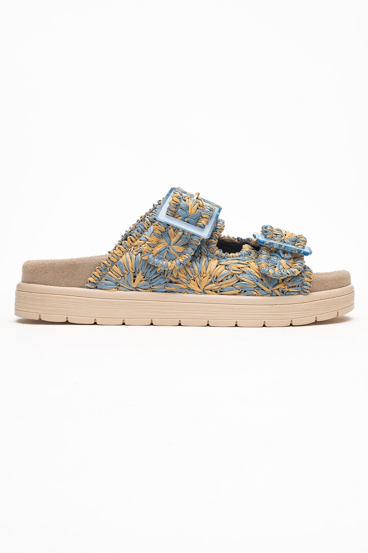 Rahatlığı şıklıkla harmanlayan MILANA, bu kez mavi ve bej rafya dokusuyla karşınızda. Deniz esintisini anımsatan mavi tonlar, bejin doğallığıyla birleşerek zarif ve huzurlu bir görünüm sunuyor. Hakiki deri iç, üst ve alt tabanlarıyla ayakta yumuşak bir dokunuş bırakırken, nefes alabilen yapısıyla gün boyu ferahlık sağlıyor. El işçiliği hissi veren rafya dış yüzeyi ve ayarlanabilir tokalarıyla stilinize hem karakter hem konfor katıyor. Şehirde yalın bir şıklık ya da tatilde doğal bir zarafet arayanlar için MILANA, göz alıcı bir tercih olmaya hazır.