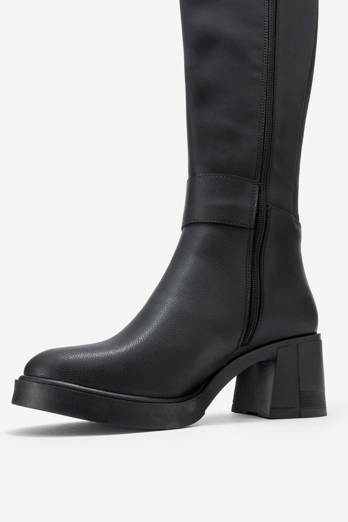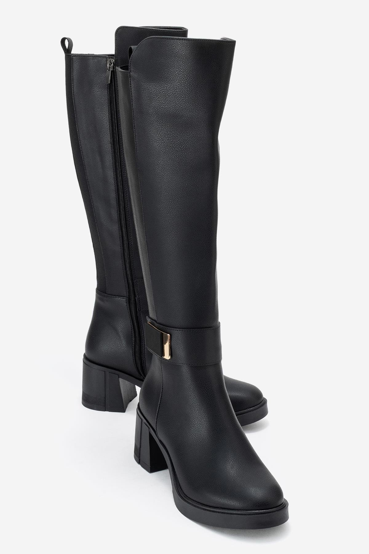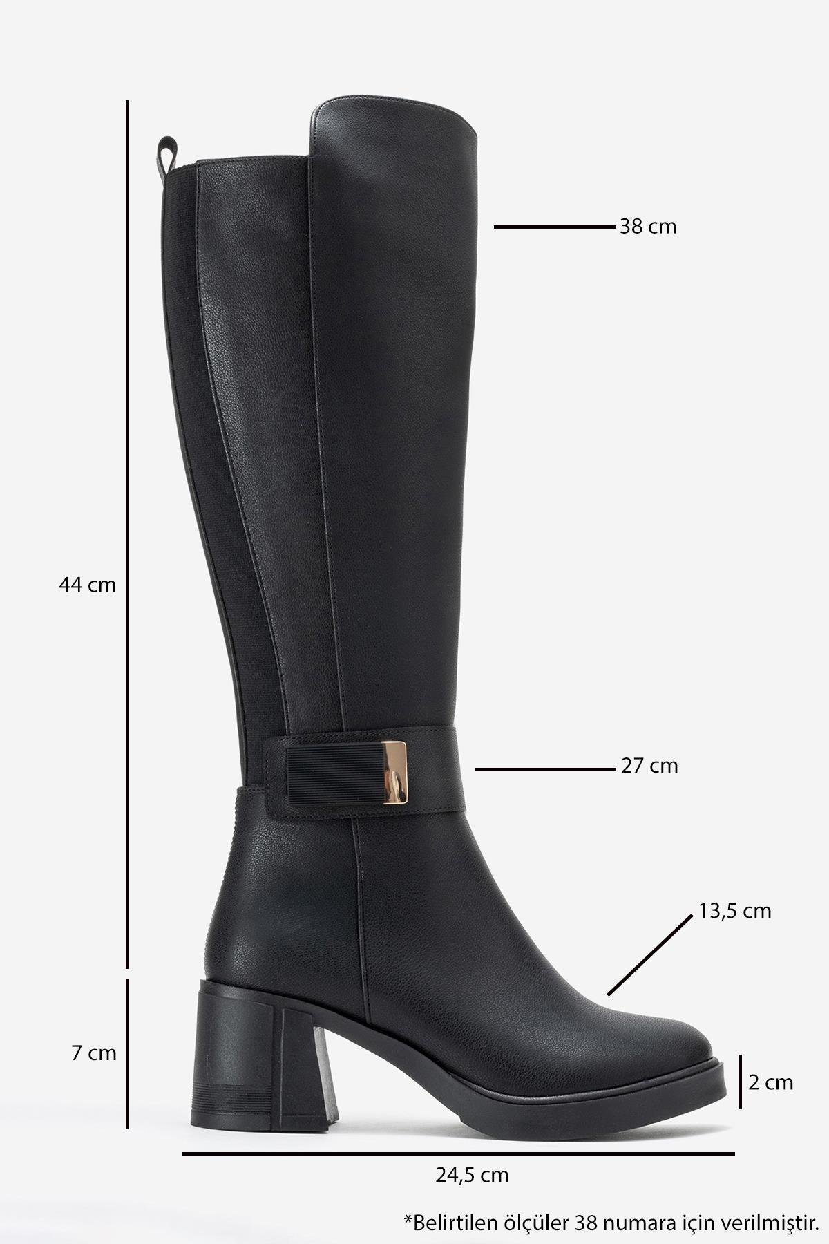 MORENİ Siyah Cilt Streç Detaylı Tokalı Kadın Kalın Topuklu Çizme (98-5285-1-SIYAH CILT)