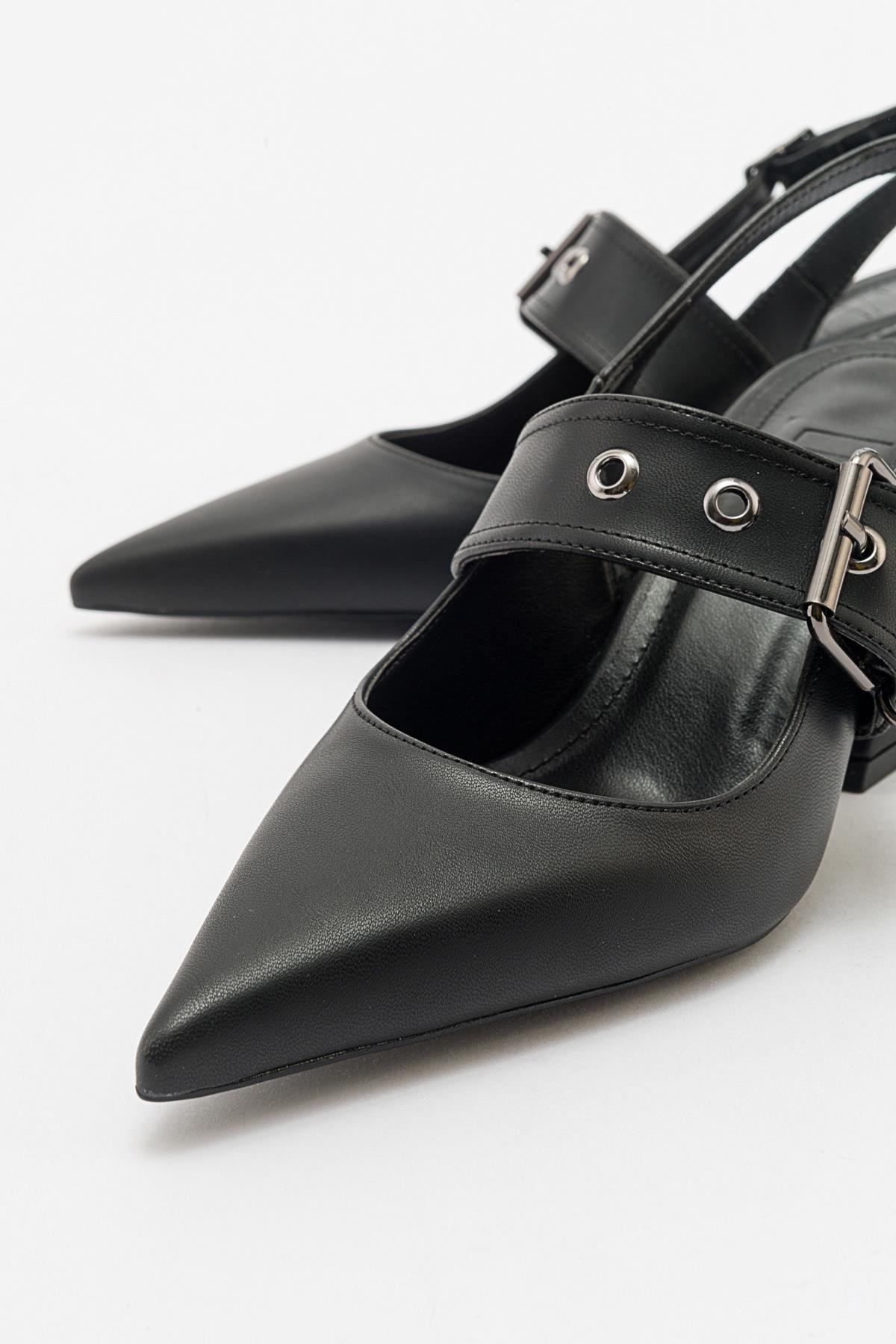NEPİDO Siyah Cilt Kadın Sivri Burun Arkası Açık Kalın Topuklu Ayakkabı (71-4042-1-SIYAH CILT)