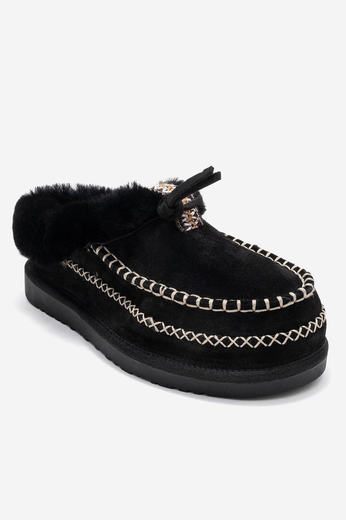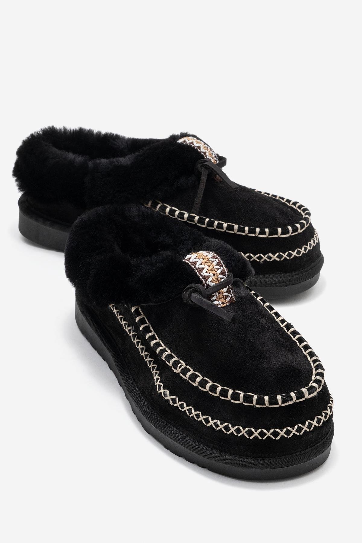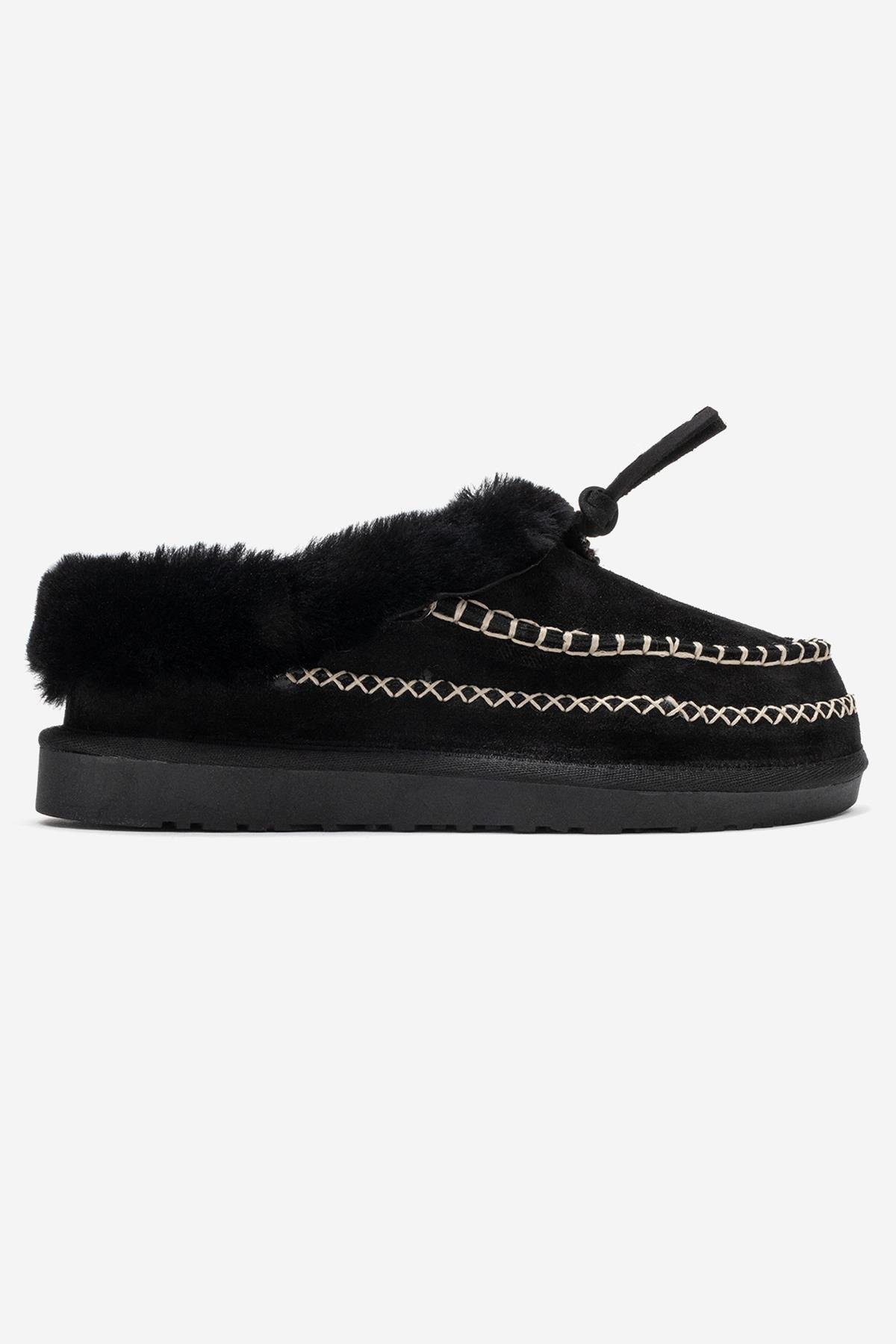 NORIEL, konfor ve lüksü en zarif haliyle sunuyor. Klasik mokasen terlik stilini modern bir dokunuşla yorumlayan NORIEL, evde veya dışarıda geçirdiğiniz anlara sofistike bir şıklık katacak. NORIEL'in dış yüzeyi, zengin ve kadifemsi dokusuyla öne çıkan %100 Hakiki Siyah Süet Deriden üretilmiştir. Ayaklarınızı sarıp sarmalayacak yoğun, Siyah Kürk Astara sahip iç yapısı sayesinde, en soğuk kış günlerinde bile üst düzey sıcaklık ve nefes alabilirlik sunar. Minimalist siyah tonunu kıran, geleneksel el dikişi detayları ve zarif bağcıklar, NORIEL'in asil duruşunu pekiştirir. Hem dayanıklı hem de sessiz yürüyüş sağlayan tabanı ile ev içi veya dış mekan kullanımları için idealdir.