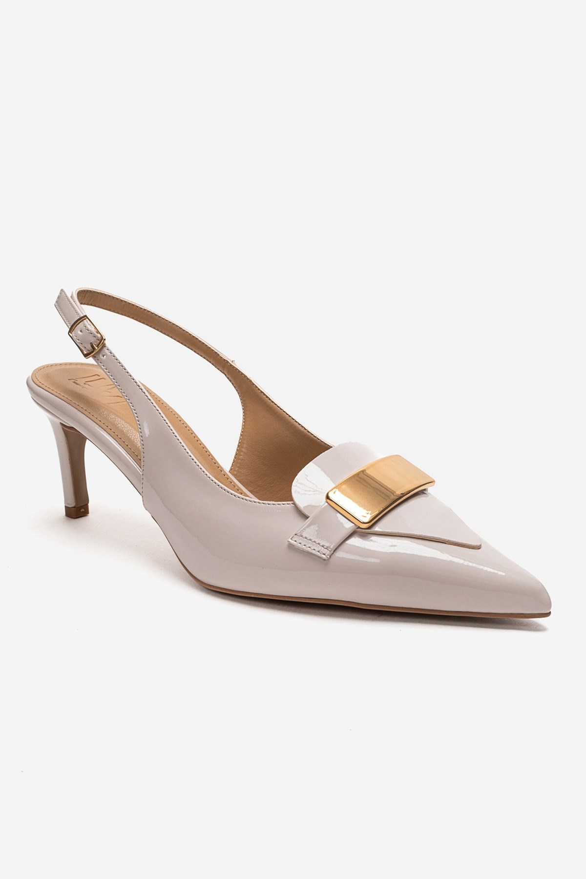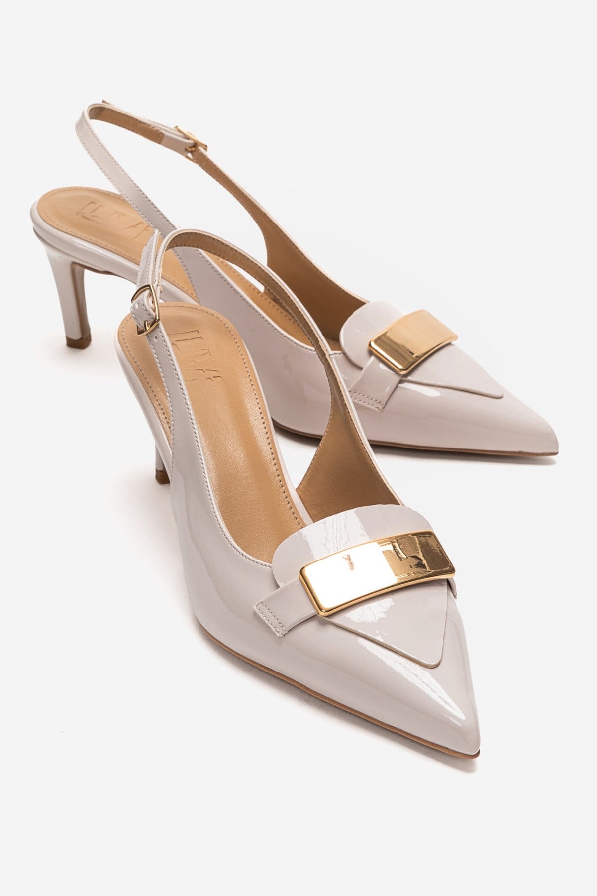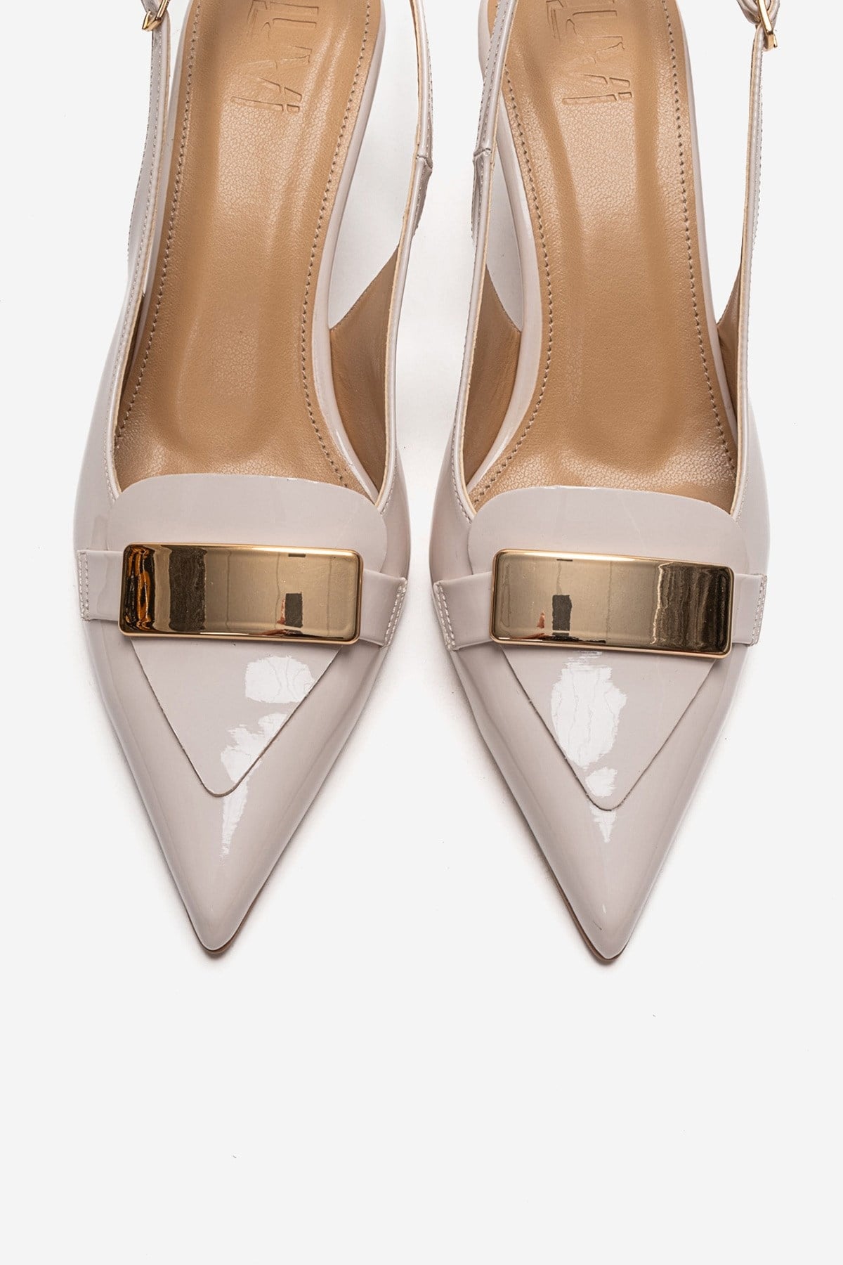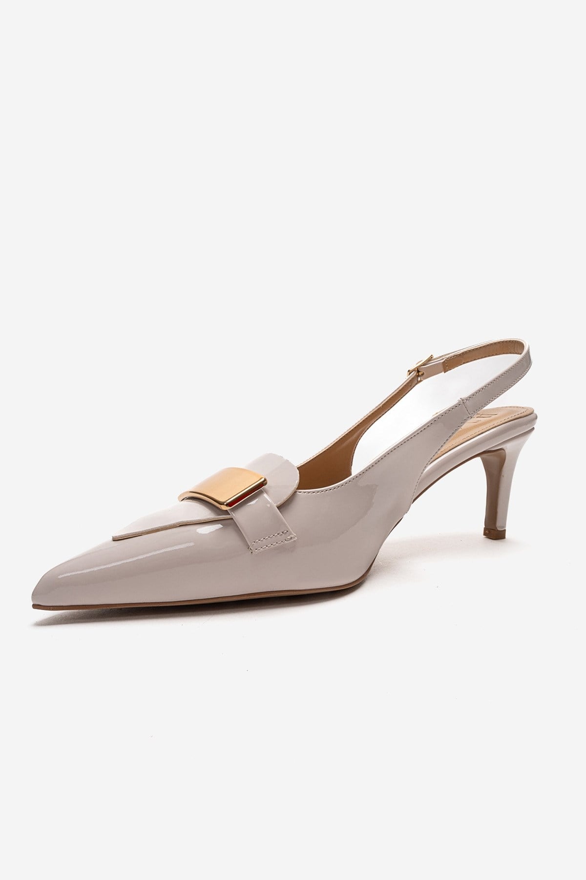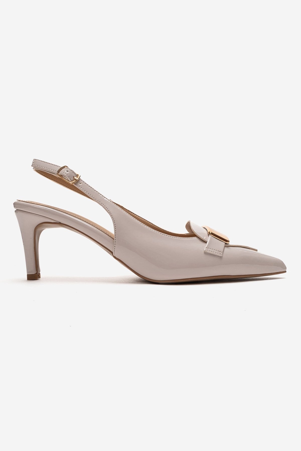 Zamansız şıklığın en saf hali SOLLENNE ile yeniden yorumlanıyor. Ekru ruganın pürüzsüz ve ışığı zarifçe yansıtan yüzeyi, her adımda sofistike bir duruş yaratırken; sivri burun formu feminen silueti net ve etkileyici bir çizgiye taşıyor. Ön kısmındaki gold toka detayı, SOLLENNE'ye modern bir ışıltı katarken minimal tasarımı güçlü bir stil imzasına dönüştürüyor. Arka açık slingback formu ve ayarlanabilir bant yapısı ayağı nazikçe sarar; rahat kalıbı sayesinde gün boyu konforlu bir deneyim sunar. İnce topuk formu, zarif bir yükselti sağlarken dengeli ve akıcı bir yürüyüş hissi verir.