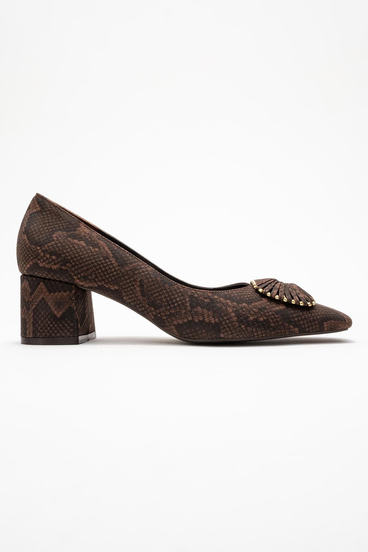 Öne çıkan detaylar: • Yılan desenli yüzey • Kare burun formu • Altın detaylı toka • Orta kalın topuk ile rahat kullanım • Hem günlük hem özel kombinlere uyumlu tasarım