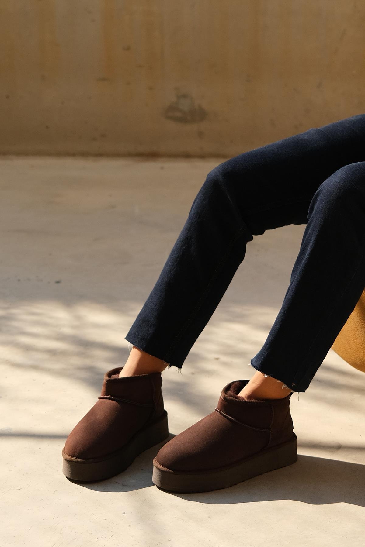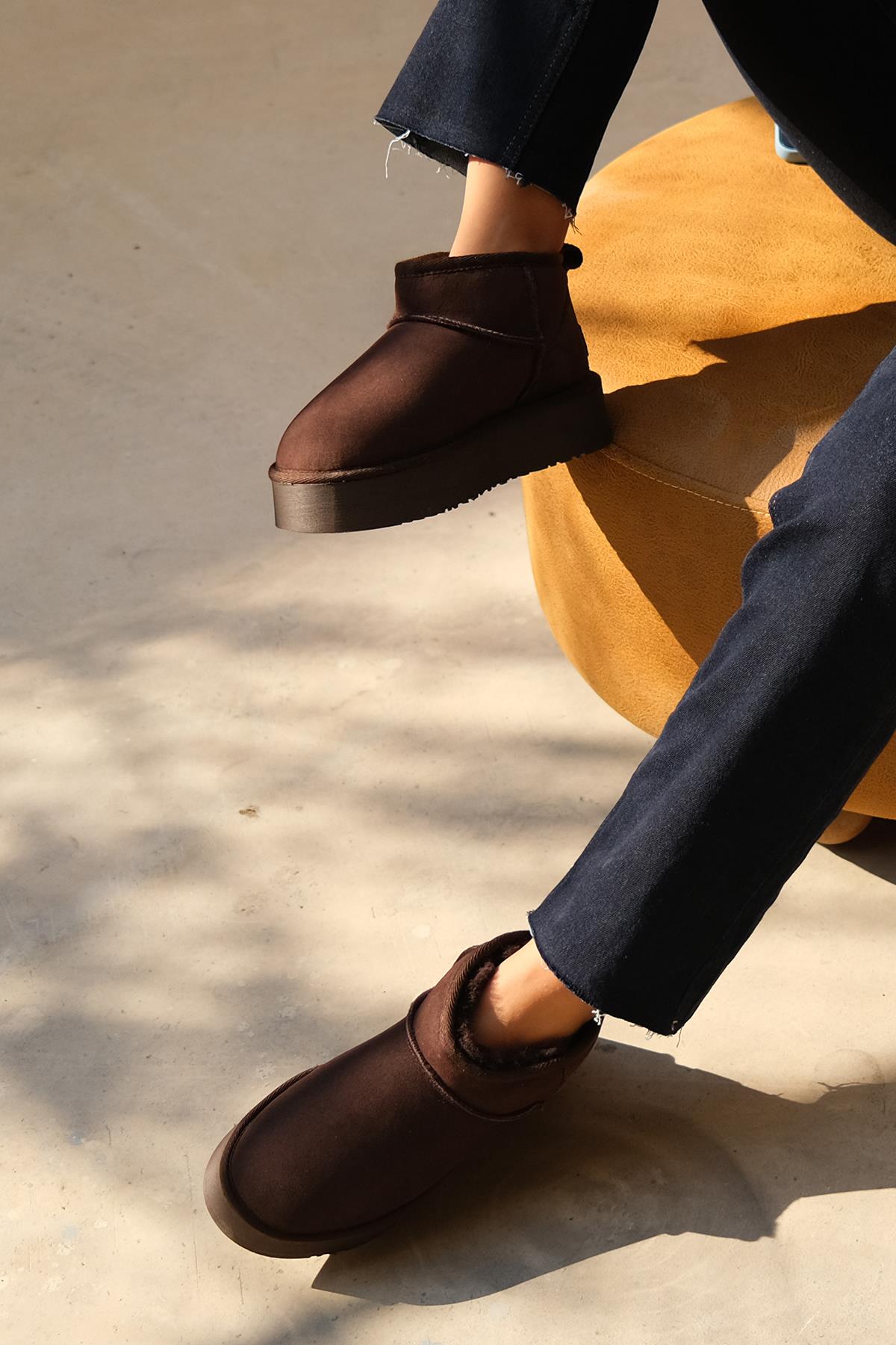 VEYRA Kahverengi Süet Hakiki Deri Kürklü Platform Tabanlı Kadın Mini Bot (183-207-4-KAHVERENGI SUET)