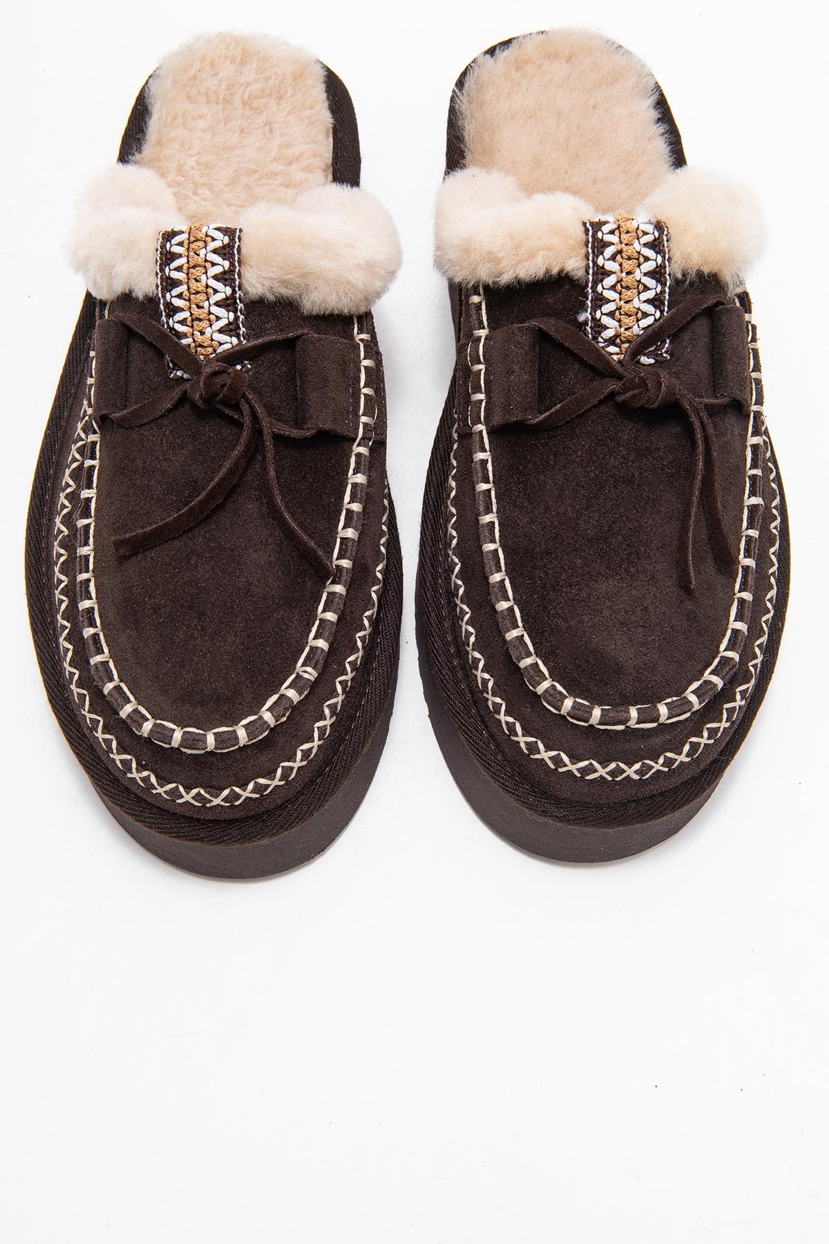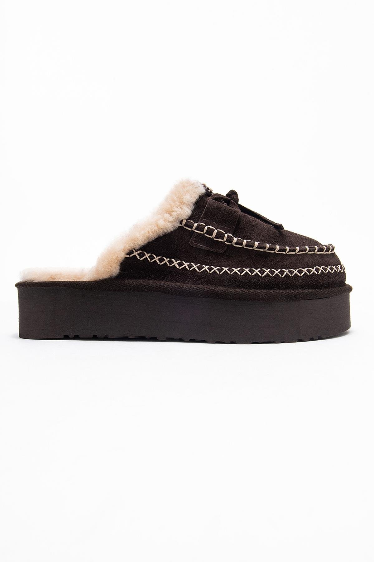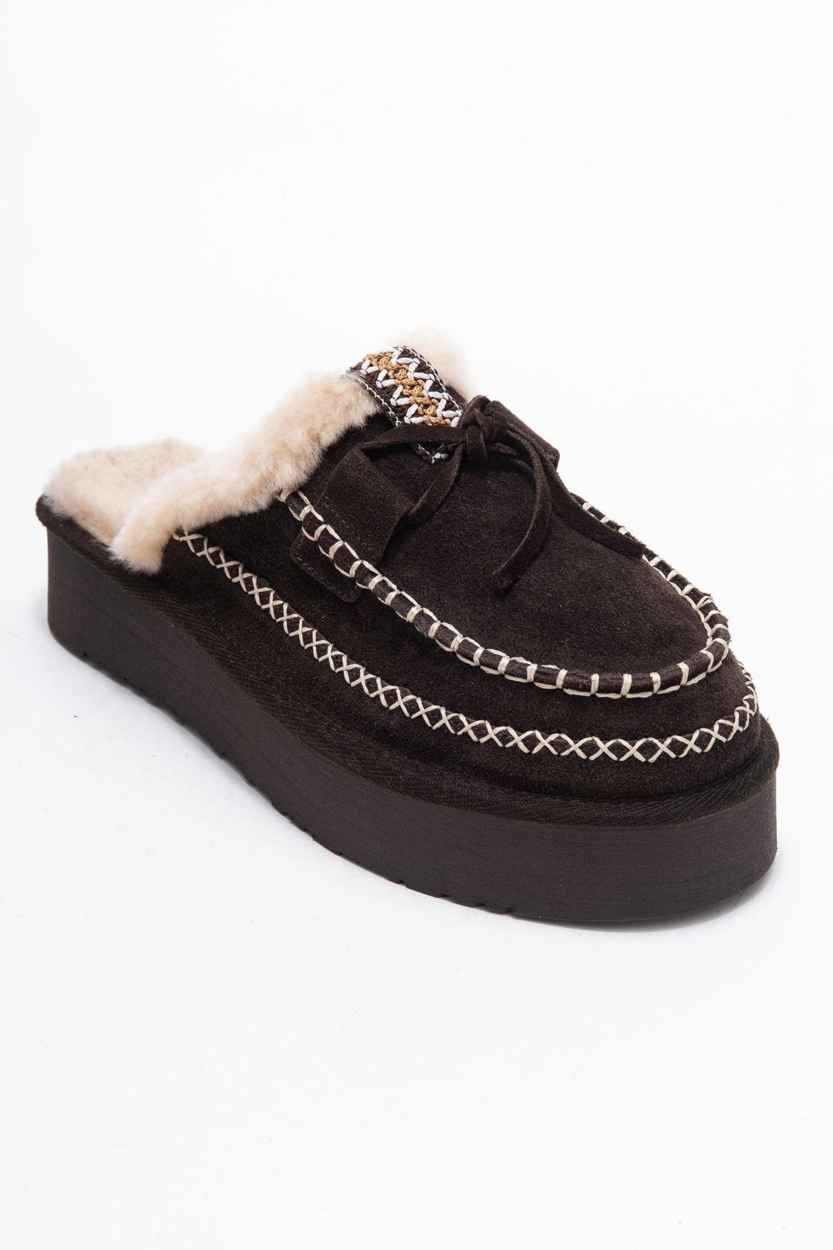 YALINA Kahverengi Süet Hakiki Deri Dikişli Kürklü Kadın Platform Tabanlı Makosen Terlik (183-708-3-KAHVERENGI SUET)