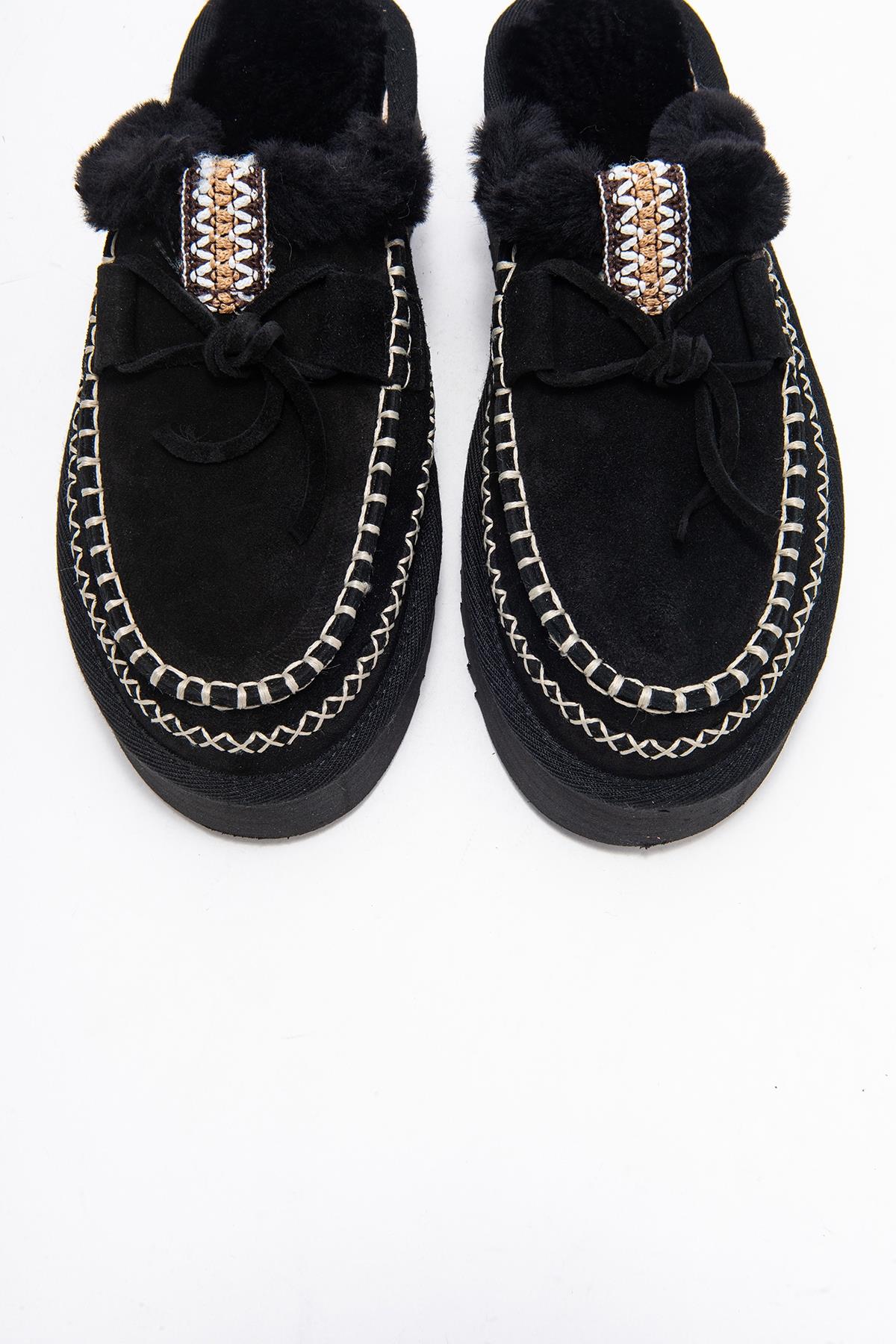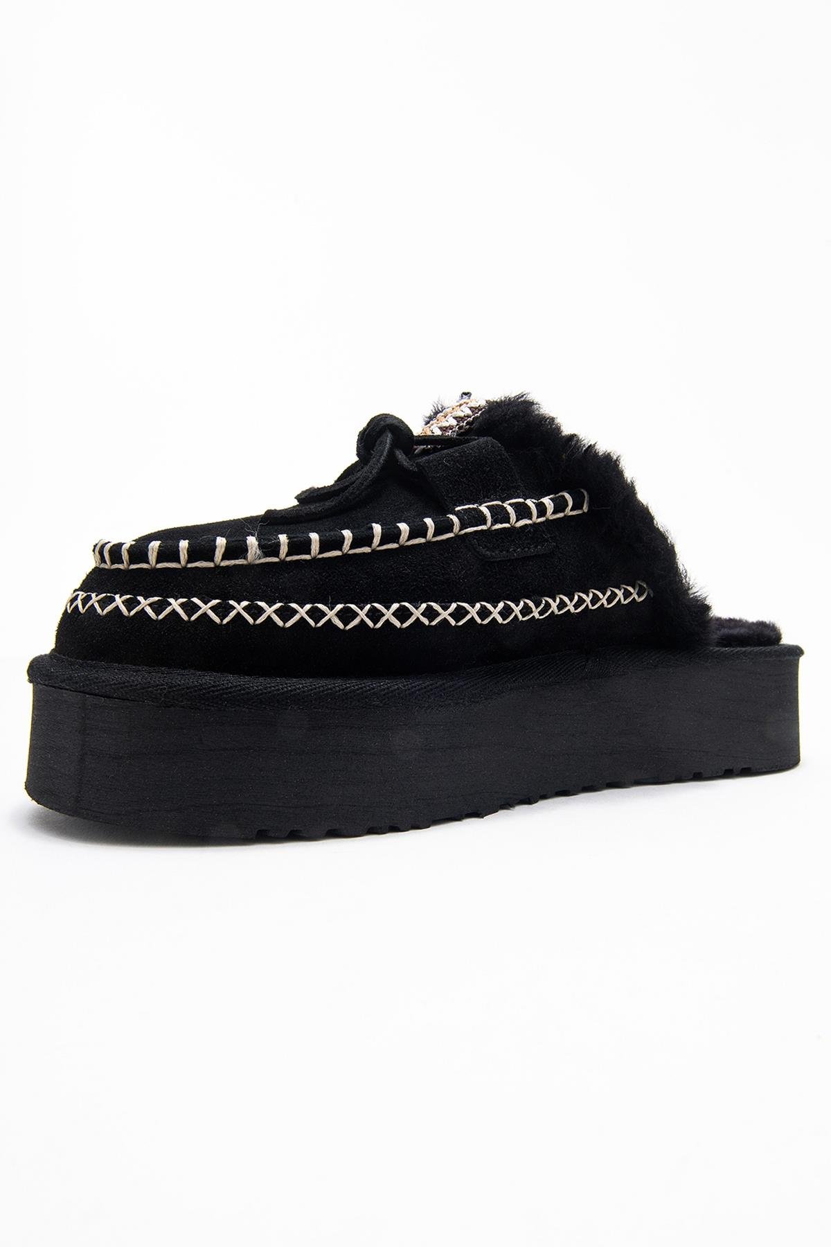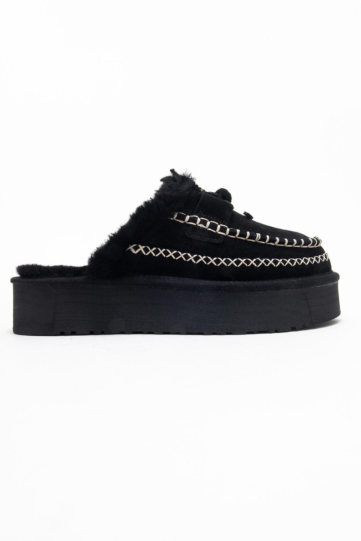 YALINA Siyah Süet Hakiki Deri Dikişli Kürklü Kadın Platform Tabanlı Makosen Terlik (183-708-2-SIYAH SUET)